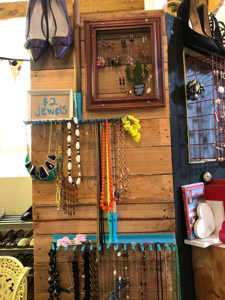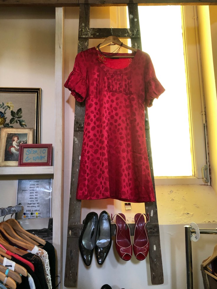 For us here at Junktion, we thought about the space we had on hand and what we had at our disposal. What would work aesthetically, but what works in a practical sense for the building. What costs next to nothing, but does the job. Did you see our potted succulent? Re-purposed teapot! Did you see our red dress on display? An old wooden ladder!