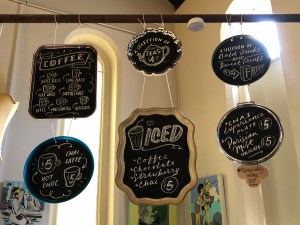 We’ve even turned chairs into display spaces, covered old trays in blackboard paint to use as menu and drink signs; we have wire filing trays as jewellery display and storage and who wouldn’t love a takeaway coffee in a cute little jam jar?